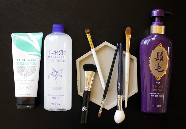 Some of the best brush products have been repurposed skincare items. The tube of Soo'Ae* Cleansing Foam is very concentrated and fantastic for washing almost any stain out of a brush. Probably the most economical, as I've been using it for about a year and maybe finished 1/4 of the tube. That's washing ~100 or so brushes pretty regularly. I like using the Naturie (OPERA in mainland China) Job's Tears Skin Conditioner as a part of my rinse, a couple drops added to the water keeps hairs sleek but not greasy. The Missha conditioner wasn't a hit as haircare (spouse HATED the scent) but works fantastically as a deep conditioning treatment for animal sourced bristled brushes. I coat the bristles and let it briefly sit saturated in product (meanwhile working conditioner into other brushes) and then rinse the batch of 5 or so when they are all coated.